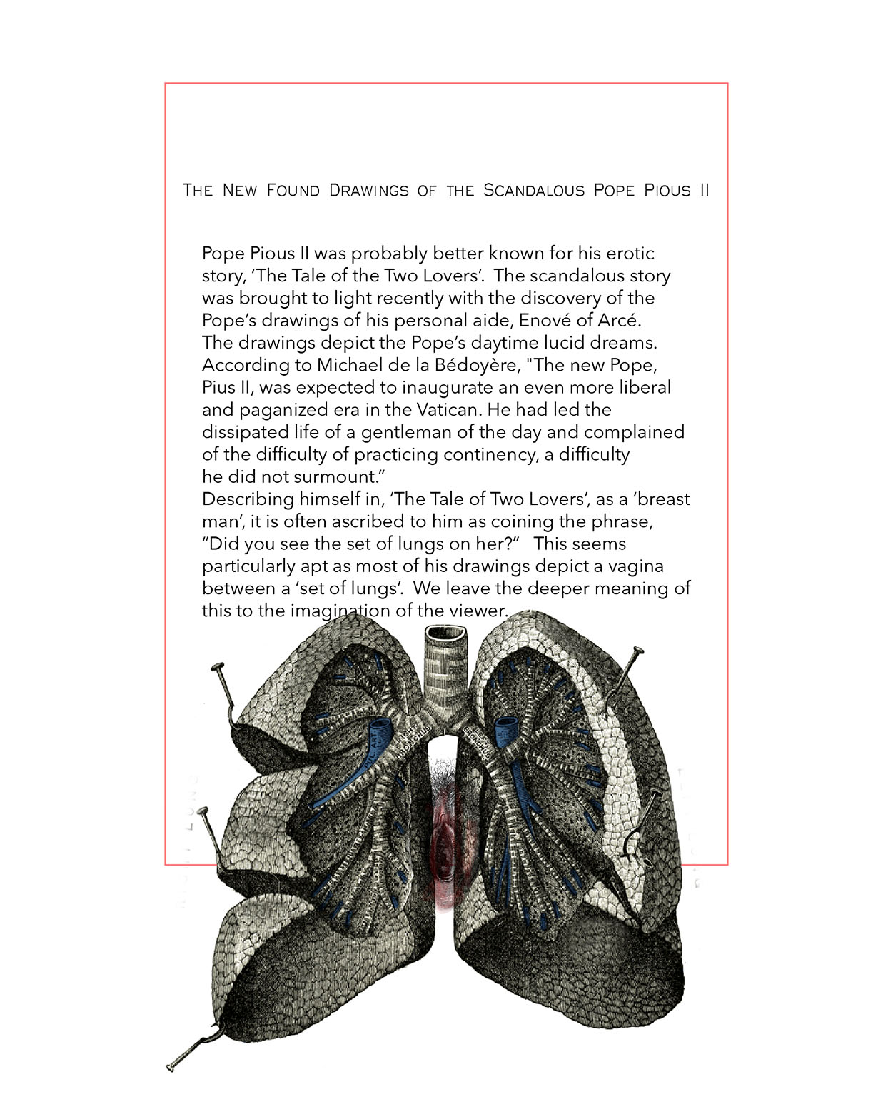 This series is a subset of 'Angels'. The conceit is that (a real person who died in 1492) Pope Pious II, known amongst other things, for writing the pornographic novel, 'A Tale of Two Lovers' ... had drawings